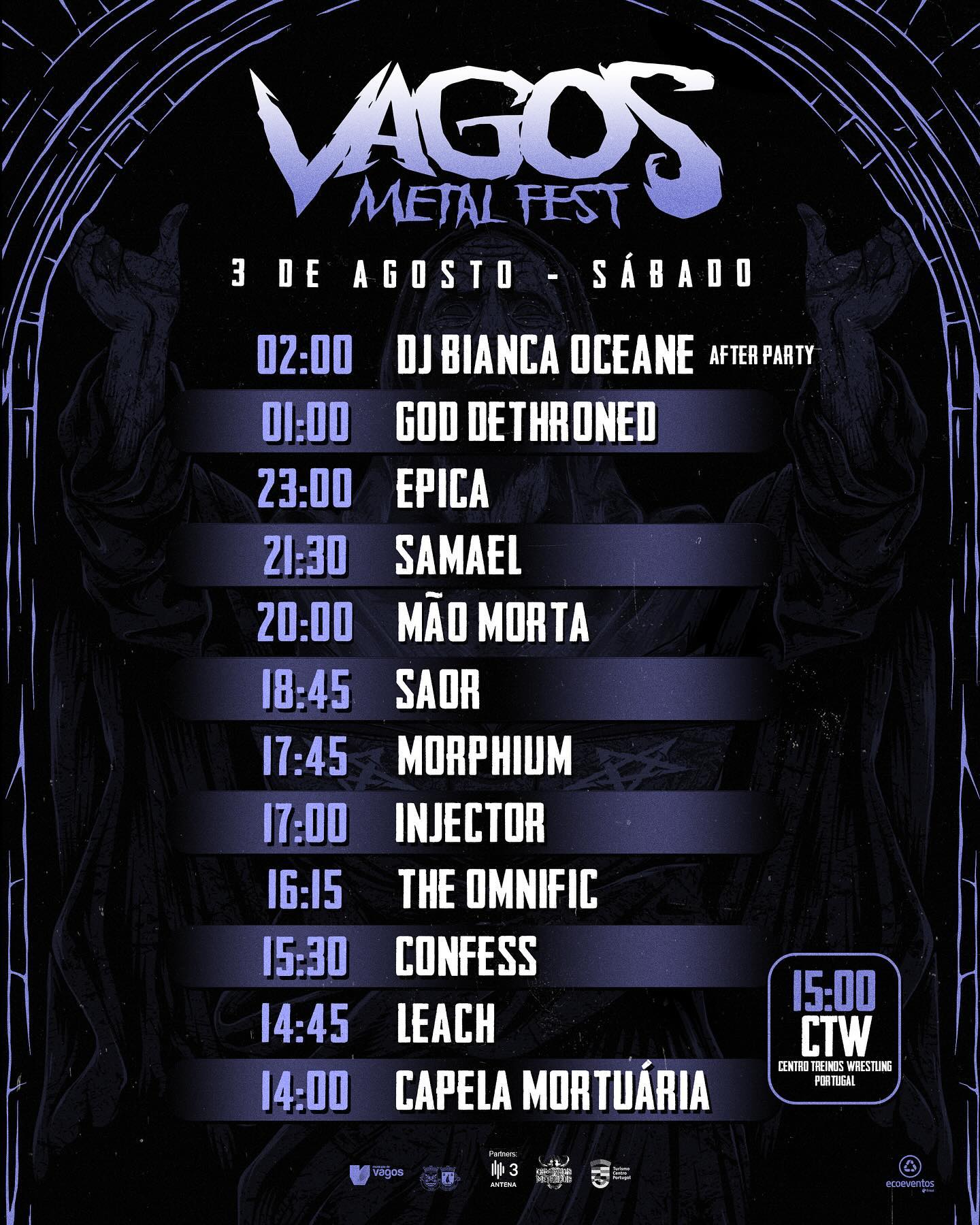Horários dos concertos do Vagos Metal Fest 2024, evento que se realiza nos dias 2, 3 e 4 de agosto, na Quinta do Ega, evento que tem como destaque os Overkill, Epica, Blind Guardian, Insomnium, Samael, UADA, Suffocation, entre outros.